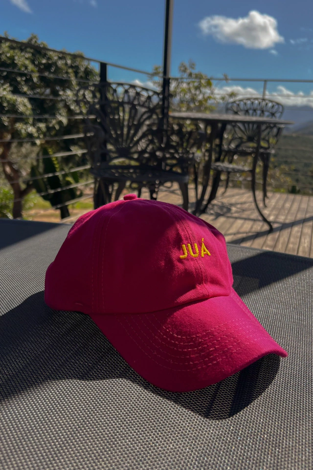 Esse aqui é o Boné Juá, no tom rosa mais lindo com nossa logo amarelinha e um juazinho na parte traseira.